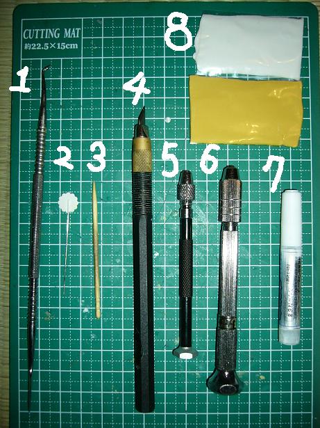 5・6.ピンバイスです。タミヤです。体の骨組みで針金をエポパテに通すときに使っています。針金は1mmのものを使っています。