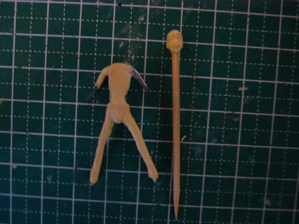 体の骨組みを作り、ポーズをとらせたらエポパテを盛り付けて肉をつけます。腕は足が乾いたあと盛り付けます。