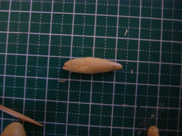 釣りといえば魚がいないと成り立たないので魚も作ってみました。これもエポパテで芯を作り、硬化後にエポパテを盛り付けてディテールを付けています。裏と表両方作るので、手で持つところがなくて苦労しましたが、指を常に湿らせて形が崩れないように優しく持ちながら作業しました。硬化後さらにヒレなどを付けていきます。