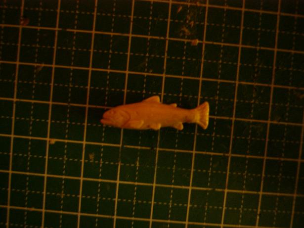 次は魚です。漫画の釣りキチ三平の絵や雑誌の作例を参考に、ホワイト・ライトブルー・マホガニーを混色し、色味を微妙に変えながら模様などを塗装してきいました。思ったよりあっさりと時間もかからずにできてしまいました。自分ではなかなか上手くいったと思います。