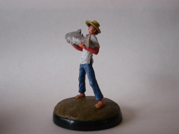 塗装はMr.カラーです。色を塗っている途中、全体の感じを見るために棚の上に置いて眺めていたら、パタンと倒れてそのまま床まで落下しました・・・。そして左手がとれ(さらに親指、人差し指も割れました)一緒に魚もとれました・・・。メンタームの効き目は抜群だったようです(泣)。